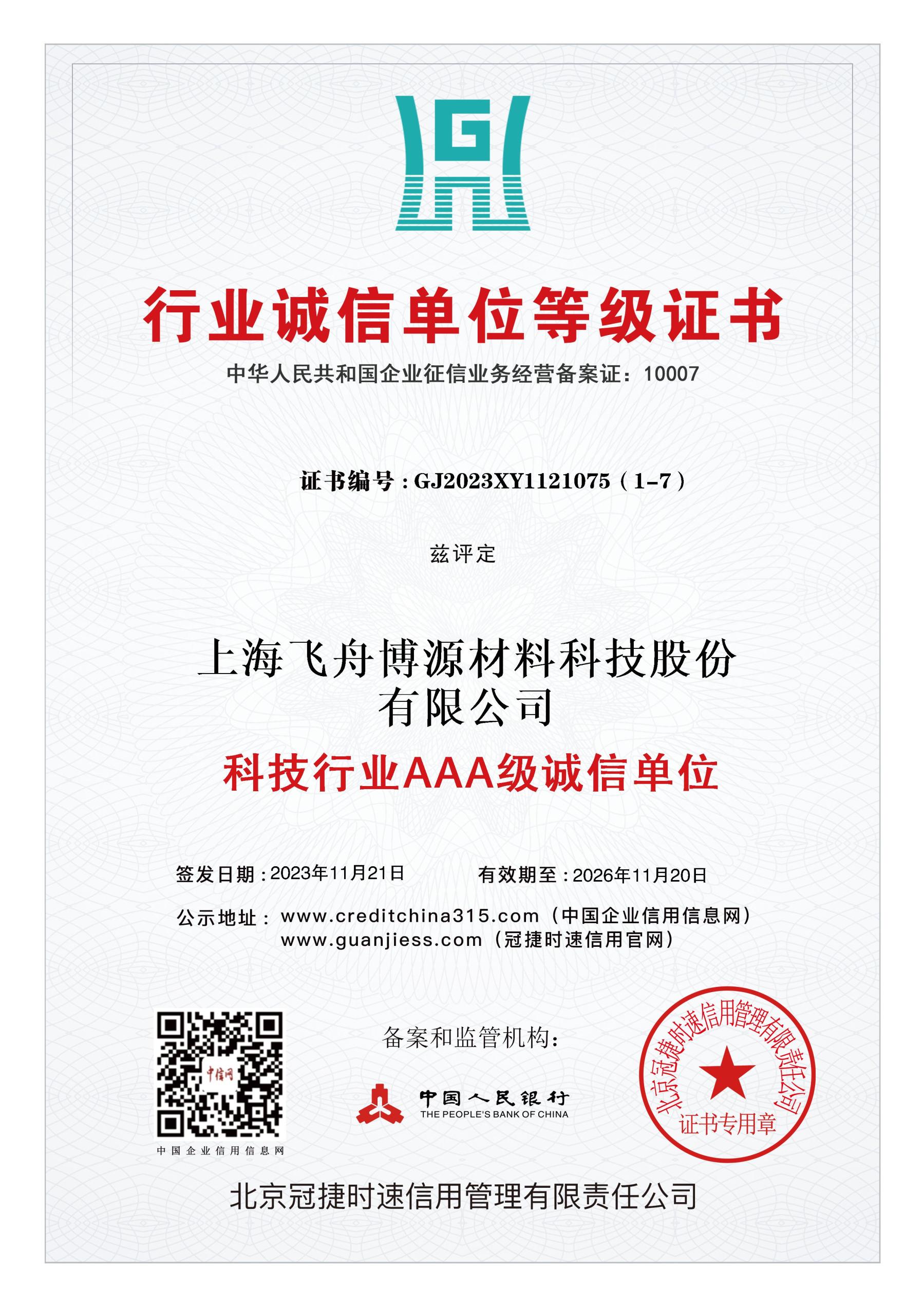 最高级别的企业信用评级,证明公司具有优秀的商业信誉和履约能力。