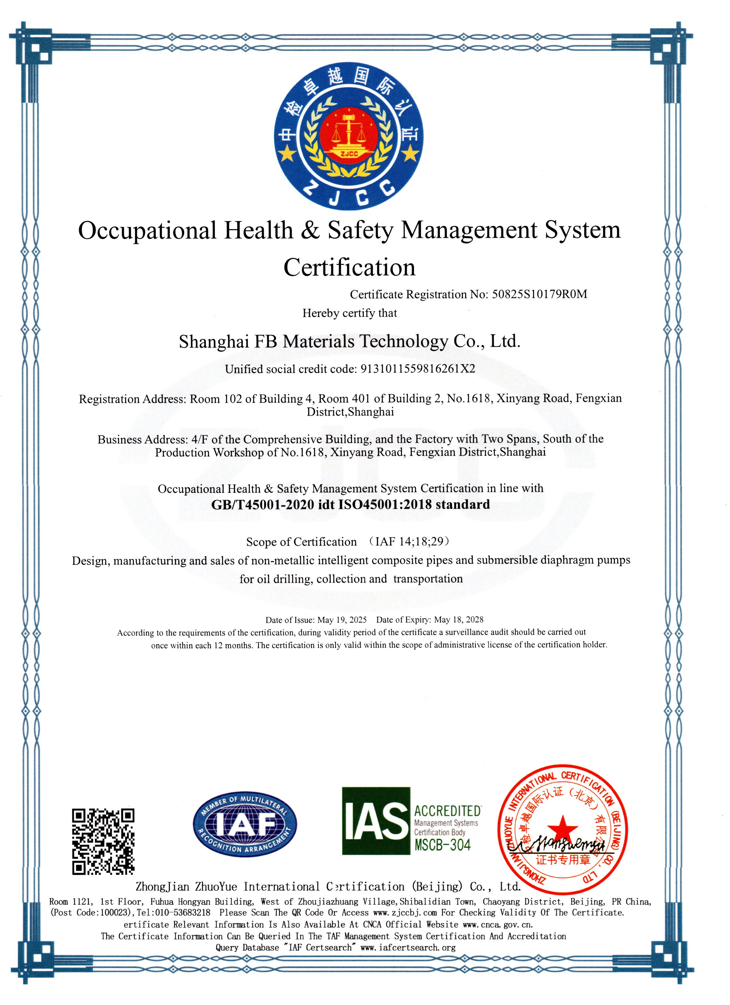 ISO 45001:2018职业健康安全管理体系认证,确保员工工作环境的安全和健康。